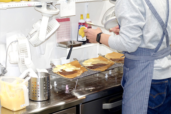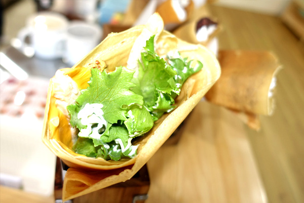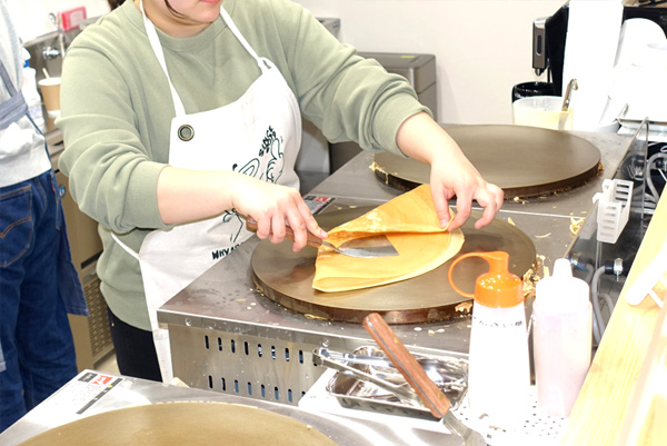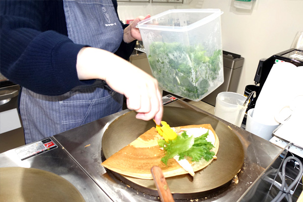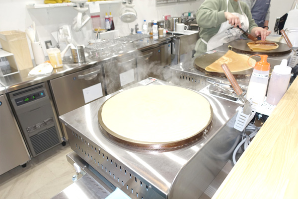 ![]() 食事系のクレープは温かい状態で出すので、この時点で具材や 野菜を乗せて味付けしたりするようだ |